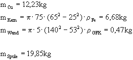 Die Masse der Spule ergibt sich aus der Summe der Massen der Kupferwicklung, des Eisenkerns und der Seitenwände: