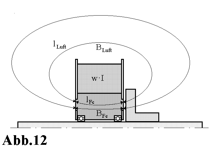 Die magnetische Flußdichte, die von der Spule erregt wird, läßt sich nur annähernd aus dem Durchflutungssatz berechnen, da die Länge des Weges der Feldlinien durch die Luft nicht bekannt ist. Die Feldlinien treten auf einer Seite des Eisenkerns aus und schließen sich dann über die Luft bis in den Eisenkern wieder hinein (Abb.12).