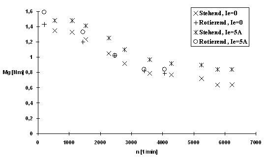 Das Diagramm 4 stellt die Funktion Mg=f(n) mit stehender und rotierender Erregung bei Ie=0A und Ie=5A dar.