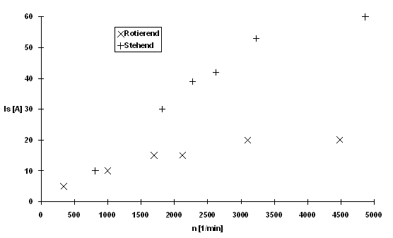 Die Differenz zwischen beiden Kurven ist nicht konkret zu erklären. Da die induzierte Spannung in beiden Fällen gleich ist, muß davon ausgegangen werden, daß der fließende Strom in der Induktionsscheibe die Anordnung in Abhängigkeit der Erregerart verändert. Möglicherweise ist die Differenz aber auch auf den Bürstenübergangswiderstand zurückzuführen. Zu Beginn der Messungen waren die Bürsten mit Schleifpapier eingeschliffen worden. Die Oberfläche der Bürsten war daher nicht glatt, sondern rauh. Durch längeren Betrieb werden die Bürstenoberflächen glattgeschliffen, was einen geringeren Übergangswiderstand zur Folge hat.
