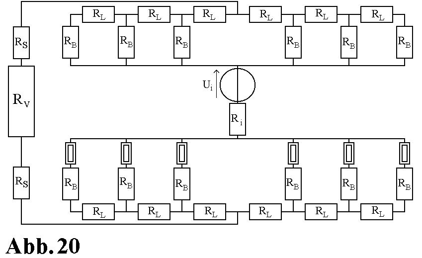 Im Bemessungsbetrieb, also bei einer Drehzahl von 6000 U/min und einem Erregerstrom von 5A ist der gemessene Laststrom um mehr als das zehnfache kleiner als der berechnete Laststrom. Der sehr viel geringere Strom ist auf den Spannungsfall am Bürstenübergang zurückzuführen. Die Patina, die sich auf dem Schleifkörper bildet, hat Halbleitercharakter. Der Widerstand der Bürsten besteht nicht nur aus dem ohmschen Widerstand, der in 2.3.2 berechnet wurde, sondern zusätzlich aus einem Widerstand, der sich mit der Diodendurchlaßspannung vergleichen läßt. In der Abbildung 19 ist der prinzipielle Verlauf der Bürstenübergangsspannung über dem Laststrom aufgetragen. Die Bürstenübergangsspannung ergibt sich aus der Summe der Übergangsspannungen Bürste/Scheibe und Scheibe/Bürste, die jeweils unterschiedlich groß und entgegengesetzt gerichtet sind. Um diesen Einfluß zu veranschaulichen, wird in das Ersatzschaltbild der Versuchsmaschine das Symbol für ein nichtlineares Bauelement eingefügt (Abb.20).