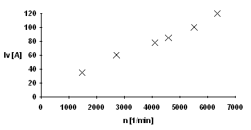 Als Belastung dient ein 600A Shunt, in dem die elektrische Leistung in Wärme umgewandelt wird. Über den Spannungsfall am Shunt kann der durch den Shunt fließende Strom berechnet werden. Aus den Leerlaufmessungen ist die induzierte Spannung bei entsprechender Drehzahl bekannt. Unter der Annahme, daß sich die induzierte Spannung bei Belastung nicht verändert, kann über die Differenz zwischen Spannungsfall am Shunt und induzierter Spannung der Spannungsfall über den inneren Widerstand Ri´ berechnet werden und mit dem fließenden Strom dann der Widerstand selbst. In Tabelle 7 sind die Meßwerte für die Drehzahl n und den Strom durch den Shunt Iv bei rotierender Erregung mit einem Erregerstrom von 5A aufgeführt.