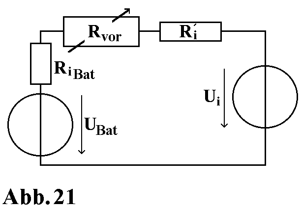 Mit Hilfe einer von außen an die Versuchsmaschine angeschlossenen Spannungsquelle läßt sich eine aufschlußreichere Messung durchführen. Es wird an die Klemmen der Sammelschiene eine Gleichspannungsquelle UBat angeschlossen, die einen möglichst hohen Laststrom durch die Induktionsscheibe treibt. Über einen Stellwiderstand Rvor wird der Strom durch die Induktiosscheibe eingestellt. Bei verschiedenen Drehzahlen wird jeweils das Gegenmoment bei ein- und ausgeschaltetem Last- und Erregerstrom gemessen.