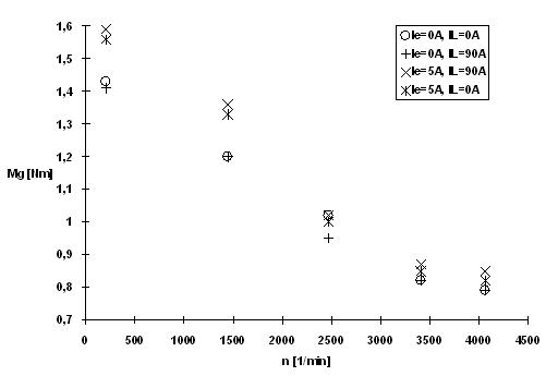 Moment Mg [Nm] auf Erregerspule bei Drehzahl n=199U/min Ie=0A, IL=0A Ie=5A, IL=0A Ie=5A, IL=83A |