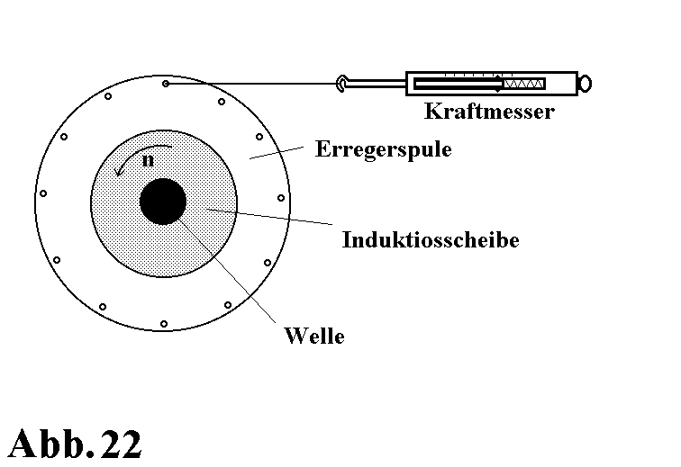 Die Klemmen der Sammelschiene können über einen Stellwiderstand an eine Gleichspannungsquelle angeschlossen werden, so daß ein Laststrom fließt. Die Erregerspule ist frei drehbar. Am Rand der Erregerspulenwand ist ein Kraftmesser derart angebracht, daß er die Kraft in tangentialer Richtung auf die Erregerspule anzeigt und über den Radius von 0,13m das Moment berechnet werden kann (Abb.22). Die Welle der Versuchsmaschine wird bei sehr geringer Drehzahl betrieben, damit das Haftreibmoment überwunden wird. Es wird die Kraft auf die Erregerspule mit eingeschalteter Erregung bei fließendem und nicht fließendem Laststrom gemessen. Bei eingeschalteter Erregung mißt man das Moment auf die Spule verursacht durch Lagerreibung und Wirbelströme. Beim Einschalten des Laststromes von 83A muß sich eine Erhöhung des Gegenmoments zeigen, das sich aus der Lagerreibung, dem Wirbelstrombremsmoment und dem inneren Moment zusammensetzt, wenn das innere Moment an der Spule angreift. Folgende Meßwerte ergeben sich: