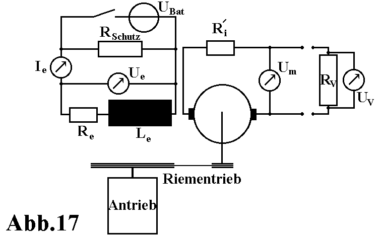 Die Abbildung 17 zeigt den Aufbau des Versuchsplatzes. Über einen Riementrieb wird die Versuchsmaschine angetrieben. Der Antrieb ist mit einer Waage, die das Antriebsmoment anzeigt gekoppelt. Die Übersetzung des Riementriebes beträgt ü=3,833, so daß das angezeigte Moment 3,833 mal größer ist als das tatsächliche Antriebsmoment. Die Drehzahl wird über einen Drehzahlmesser von der Antriebswelle abgegriffen. Die Erregerspule wird von der Batterie UBat gespeist. Um den Lichtbogen beim Ausschalten klein zu halten, ist parallel zur Erregerspule ein Feldschutzwiderstand geschaltet. Der Shunt RV, der als Belastung dient, ist nur bei der Belastungsmessung an die Versuchsmaschine angeschlossen. UV ist die Meßspannung, die im Leerlauf der induzierten Spannung Ui entspricht.