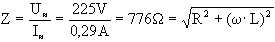 die Spule mit 225 V Wechselspannung gespeist wird. Die Spule ist als eine Reihenschaltung aus ohmschem Wirkwiderstand und induktivem Blindwiderstand anzusehen. Der gemessene Betrag des Scheinwiderstandes Z ist dann