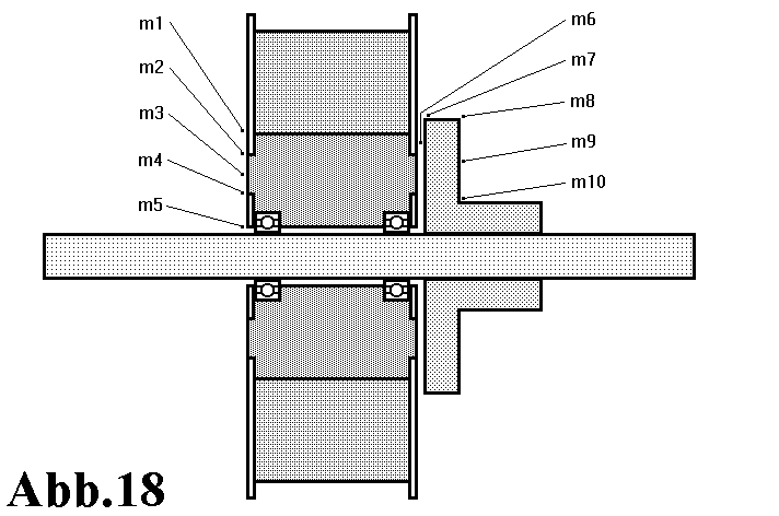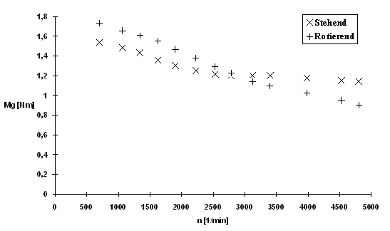 Das Gegenmoment Mg, welches an der Welle zum Antriebsrad anliegt, entspricht der Summe aus Reibmomenten und dem inneren Moment Mi. Das innere Moment Mi ist bei Bemessungsbetrieb im Verhältnis zum Reibmoment um den Faktor 80 kleiner. Der Einfluß auf das Gegenmoment ist auf der Drehmomentwaage gerade noch abzulesen. Um feststellen zu können, ob bei Leistungsabgabe ein inneres Moment auftritt, ist es nicht sinnvoll, das Moment an der Welle zu messen und über der Drehzahl aufzutragen. Die Abhängigkeit des Reibmoments von Drehzahl, Stromfluß und Temperatur und das Auftreten von Wirbelstrombremsmomenten ist zu komplex, um aus dem Verlauf Mg=f(n) Rückschlüsse auf das innere Moment zu ziehen.