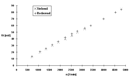 Wie erwartet, ist nach Gleichung (11) die induzierte Spannung linear abhängig von der magnetischen Flußdichte und bei Verdreifachung des Erregerstromes verdreifacht sich die Steigung der Geraden ebenfalls. Dieses trifft nur solange zu, bis die Sättigung des Eisens erreicht ist, denn dann wächst die Induktion nicht mehr linear mit dem Erregerstrom.